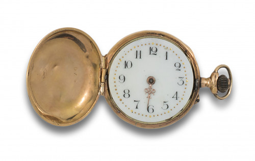 Reloj de bolsillo de dama saboneta, movimiento remontoir. Caja de oro amarillo de 18 kt. Diámetro: 29 mm. Esfera beige con numeración arábiga en negro, (falta la aguja de las horas y el cristal). Precisa ajuste. Peso: 17 Gr..