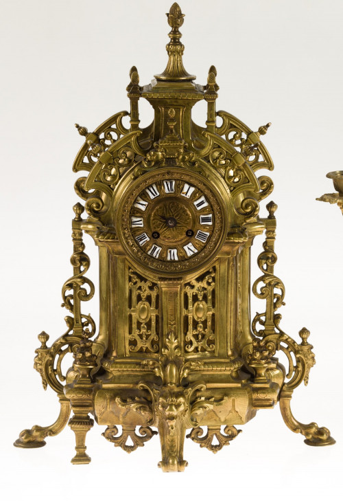 Reloj estilo Napoleón III, Francia, ffs. S. XIX. De bronce dorado rematado en piña. Maquinaria París. Falta péndulo y agujas. Remate pegado.