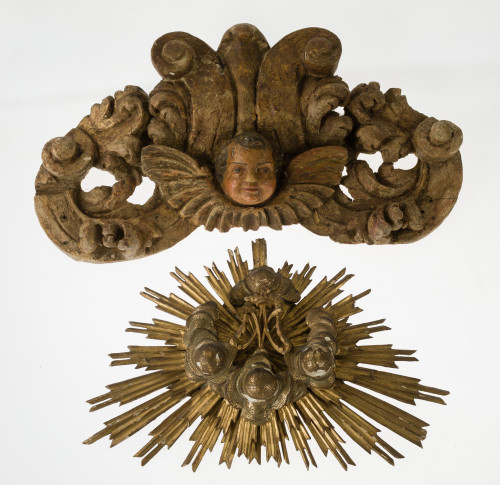 Remate de madera tallada y policromada, España, S. XVIII y posterior. Representando cabeza de ángel con volutas. Repolicromado y una de las alas repuesta.
