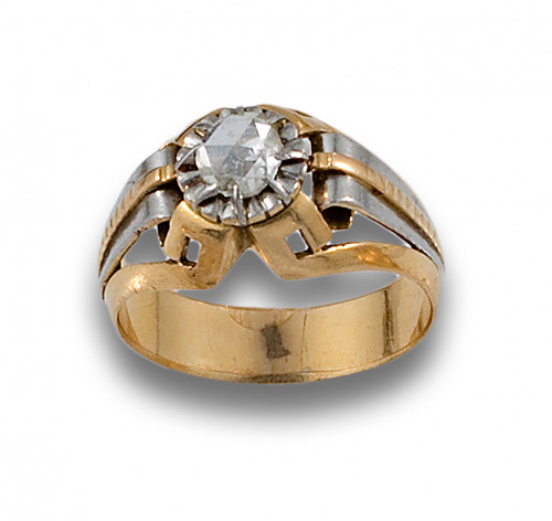 246 SOLITARIO CABALLERO ORO DIAMANTE T. HOLANDESA Solitario de caballero de oro amarillo y vistas en blanco de 18 kt., centro con diamante, talla holandesa. Peso: 7,17 Solitario de caballero de oro amarillo y vistas en blanco de 18 kt., centro con diamante, talla holandesa. Peso: 7,17Peso: 7.17 gr.