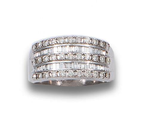 Sortija ancha de oro blanco de 18 kt. Formada por hileras de diamantes, talla brillante y centros de diamantes, talla baguette. Engaste en garras y en carril.