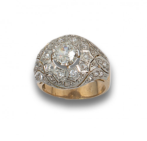 Sortija bombé de oro amarillo de 18 kt. con vistas en platino formada por centro de diamante, talla antigua de 0.75 ct. y orlado de diamantes, talla rosa