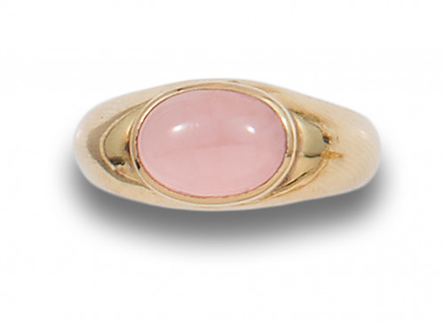 Sortija de oro amarillo de 18 kt. Formada por un cabujón oval de rodocrosita, engastada en chatón. Peso: 3,6 Gr..