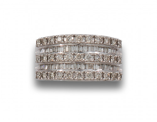 Sortija en oro blanco de 18 kt. con bandas de diamantes, talla brillante y baguette. Engaste en garras y en carril.