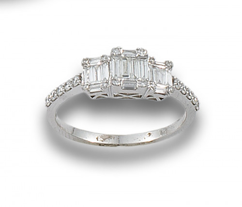 Sortija de oro blanco de 18 kt. formada por diamantes, talla baguette y brillante.