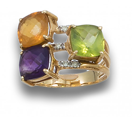 SORTIJA DE PERIDOTO, AMATISTA, TOPACIO Y DIAMANTES, EN ORO