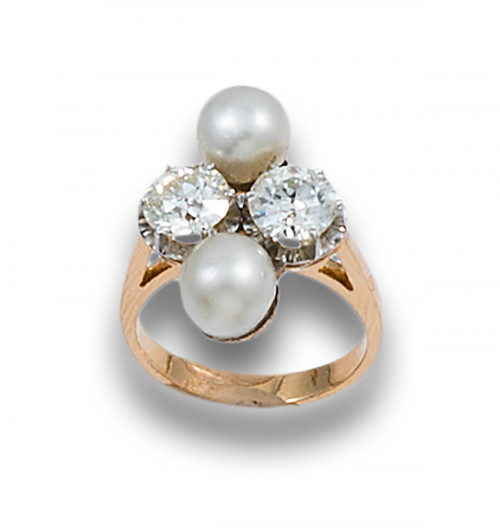 Sortija en oro amarillo de 18 kt. con dos perlas calibradas en 4 mm. y dos diamantes, talla antigua, con un peso total estimado de 1.60 ct.