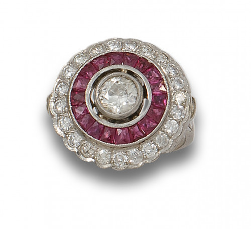 Sortija ojo de perdiz de platino. Centro de diamante, talla antigua, estimado en 0.60 ct, engastado en chatón y orlado de rubíes calibrados engastados en carril y orla de diamantes, talla brillante, engastados en grano.