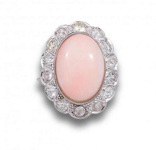 Sortija rosetón de oro blanco de 18 kt. Formada por centro cabujón de coral piel de ángel orlado de diamantes, talla antigua, peso total estimado de 2 ct.