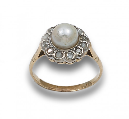 Sortija rosetón de oro amarillo de 18 kt. con vistas en platino. Centro de perla cultivada central de 8 mm. de diámetro orlada de diamantes, talla antigua y talla rosa. Peso: 4.30 Gr..
