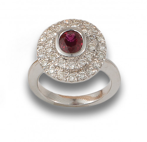 SORTIJA ROSETÓN DE ORO BLANCO, DIAMANTES Y RUBÍ