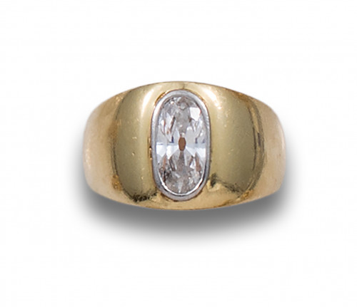 Sortija, tipo sello, de oro amarillo de 18 kt. Formada por un diamante, talla oval, estimado en 0.80 ct. engastado en chatón de oro blanco.