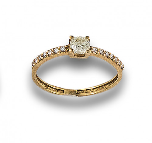 Sortija solitario de oro amarillo de 18 kt. formada por un diamante central, talla brillante, peso estimado de 0.20 ct. engastado en garras y flanqueado por diamantes, talla brillante