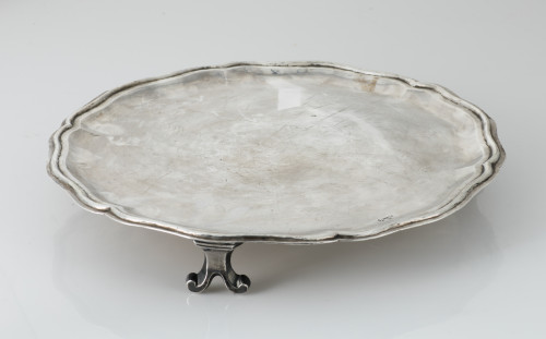 Antigua salvilla en plata cordobesa, 1793, marcas de Mateo Martínez. Borde moldurado y pies en doble voluta.