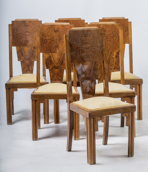 De roble y respaldo chapado en raíz de nogal. Precisan repaso de barniz.