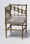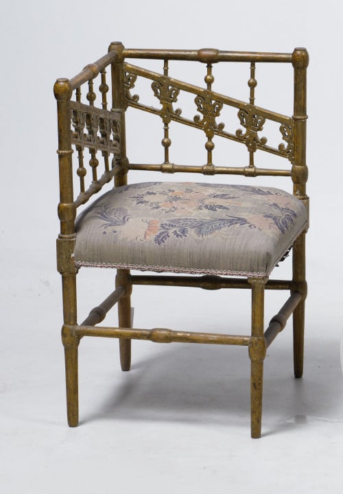 Silla de esquina España c. 1910. Respaldo torneado y calado con decoración de lazada. Restos de dorado. Faltas y restauraciones. Medidas: 68 x 41 x 40 cm.