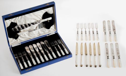 Fish cutlery set, in English silver metal and mother-of-pearl handles. There are six forks, six shovels and two serving cutlery.