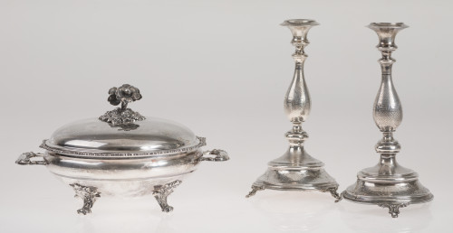 Sopera en plata contrastada, Ley 916, España, S. XX. Con tapa con decoración de flores. Marcas en la base.