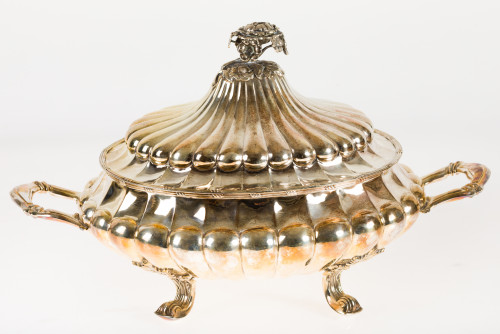 Sopera con tapa en plata española con decoración gallonada. Tapa rematada con decoración de flores.