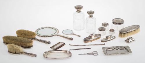It consists of: two mirrors (one of them associated smaller and made of silver metal), four brushes, a comb, two comb holders (one of them associated), three compacts of different sizes, two perfumers, two polishers, a bottle small and two associated trays (one of them made of silver metal) and some scissors (associated). Small dents. Measurements: 15 cm for the largest perfumer.