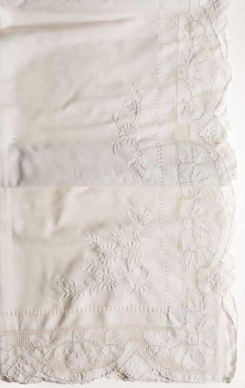 Ecru tergal tablecloth with embroidered floral, fretwork, and filigree motifs. Includes twelve napkins. Dimensions: 360 x 180 cm.