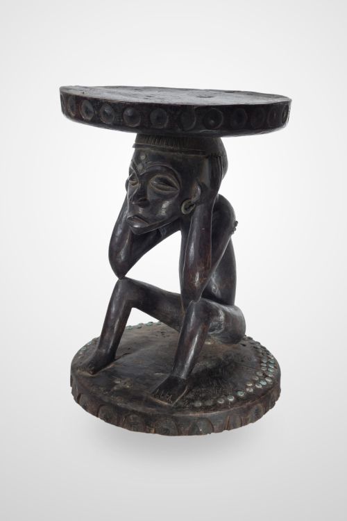 Stools are a minor art form for the Tchokwe, who are best known for their impressive masks and figurines. The chief's stool shows a female figure seated with her elbows on her knees and the seat above her head, a pose commonly used to represent ancestral spirits in the artistic vocabulary of the Tchokwe and related peoples. This posture is associated with elders, people who have deep thoughts, and also with the burial position of chiefs and important members of the community. Height: 50 cm Reproduced: Catalogue “Africa Babel: the Art of a Continent”, p. 253 left.