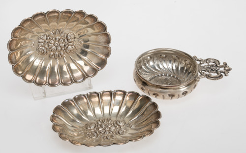 Two of them are a pair with gallon decoration and decoration of flowers in relief on the seat; the other with a handle and coin decoration. Contrasted markings on the seats. Small dents. Total weight: 160 gr. Measurements: 12 x 9.5 cm the largest.