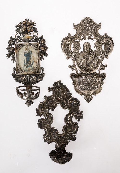 Tres benditeras de plata, España, S.XVIII y posterior. Una Rococó, otra Neoclásica, amnbas del siglo XVIII y la tercera con imagen de la Virgen entre ángeles del siglo XX.
