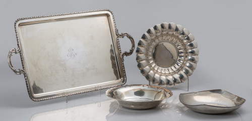 Tres centros de plata española, Ley 916. Dos de ellos con decoración gallonada. Marcas en las bases. Pequeñas abolladuras.