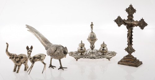 Lote compuesto por tres figuras de animales en plata española ley 916: un faisán, un ciervo y un elefante. Peso total: 895 gr.