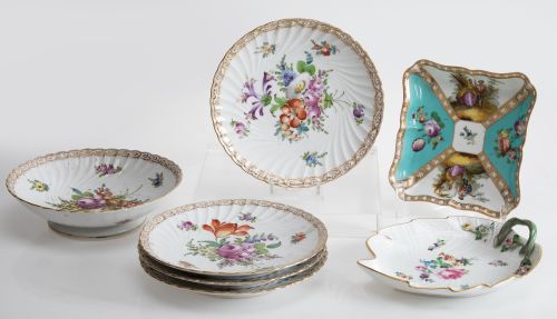 One in the shape of a leaf from the Meissen manufacture with hand-painted and applied flower decoration. The other with gilded reliefs and compartmentalised decoration with two gallant scenes. Marks on the bases. Measurements: 5 x 19 x 21 cm, the one from Meissen.