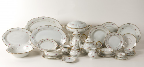 Vajilla de porcelana, España, S. XX. Decoración floral estampada y realces en dorado. Compuesta por:12 platos hondos, 24 platos llanos, 8 platos de postre, 12 platos de merienda, 11 tazas de té con 12 platos, 11 tazas de café con 12 platos, 1 tetera, 1 cafetera, 2 jarras de leche, 2 azucareros, 1 cenicero, 1 ensaladera, 1 sopera (tapa rota), 1 salsera, 6 fuentes ovaladas de diferentes tamaños y 1 fuente redonda. Asociadas 6 tazas de consomé con sus platos.