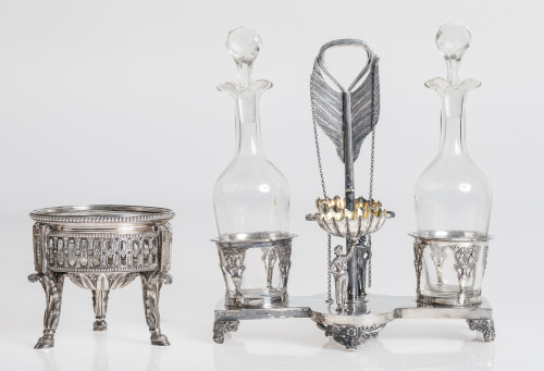 Recado de vinagreras con soporte en plata española en su color con marcas de Haro, primera mitad SXIX,  platero Manuel Orante.