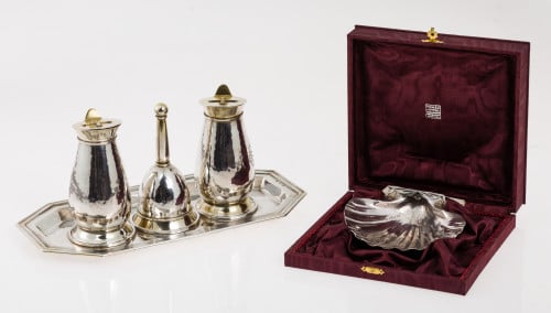 Juego de vinajeras litúrgicas, con su campanilla, en plata española ley 916.