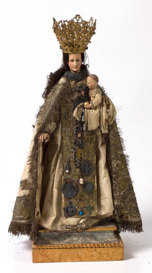 Virgen con El Niño, imagen de vestir de madera tallada y policromada con ojos de pasta vitria, hábito de seda bordada con hilos de metal y medallas religiosas aplicadas. Corona de metal dorado y aplicaciones de cristales de colores, escuela valenciana, S. XIX. Medidas: 64 cm