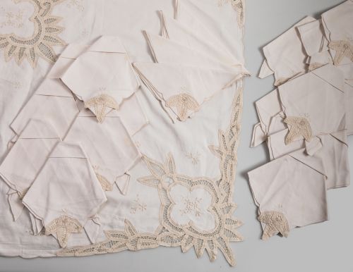 With openwork embroidery and bunches of flowers in raw thread. With 19 napkins. Measurements: 400 x 150 cm