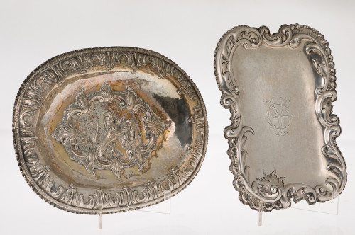 Bandejita en plata española. Greca de volutas de acanto y rocalla al borde. Iniciales grabadas. Peso: 390 gr.