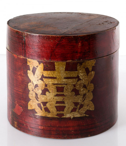 Caja china en madera pintada en rojo, con motivo de caligrafía en dorado.