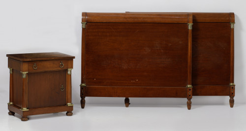 Conjunto de dos cabeceros y mesilla de noche, estilo Imperio. Madera simulando caoba con aplicaciones de latón dorado S XX. Faltas en el barniz y tapa de la mesilla desencolada. Cabecero: 100 x 114 cm. Mesilla: 60 x 56 x 37 cm.