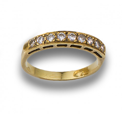 Media alianza de oro amarillo de 18 kt. formada por 9 diamantes, talla brillante, peso estimado de 0.40 ct. engastados en garras.