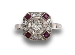 SORTIJA CUADRADA, ESTILO ART DÉCO, DE DIAMANTES, RUBÍES Y PLATINO