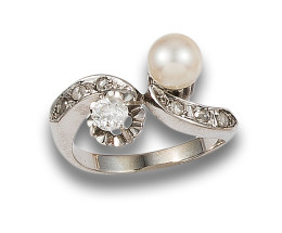 BYPASS RING WITH DIAMONDS AND PEARLS, IN PLATINUM