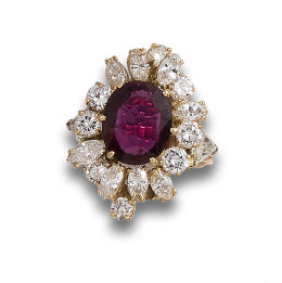 SORTIJA DE RUBÍ OVAL DE 2.94 CT. Y DIAMANTES, EN ORO AMARILLO
