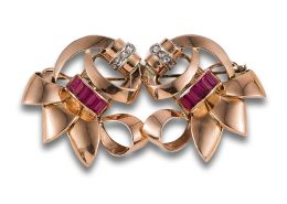 CHEVALIER BROOCH, 1940s, DOUBLE CLIP WITH SYNTHETIC DIAMONDS AND RUBIES, IN YELLOW GOLD