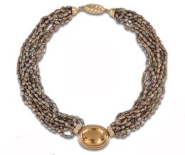 RIVER PEARL AND QUARTZ NECKLACE WITH DIAMONDS, IN YELLOW GOLD