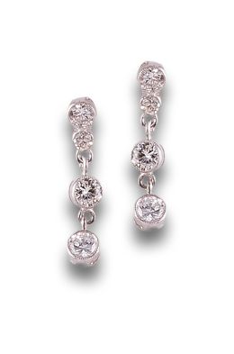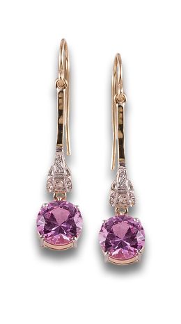 Long, antique-style earrings with diamonds and French roses, in yellow gold and platinum