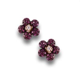 Diamond and ruby ​​flower earrings, in black and yellow gold