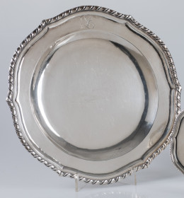 Lote compuesto por un centro de mesa, una pareja de platos de plata de ley 916 y un centro de metal plateado, España, S.XX