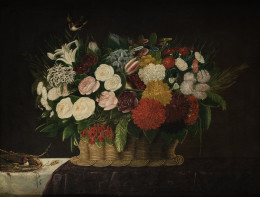 SPANISH SCHOOL (Late 19th century - Ppios. 20th century) "Still life with basket of flowers and birds"