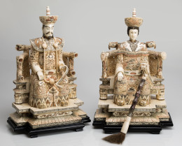 "Emperor" and "Empress" pair of carved and inked bone sculptures, China, mid 20th century